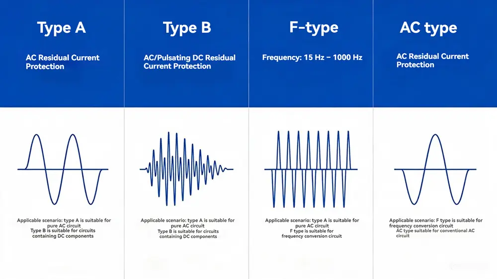 | Тип на преостаната струја | Тип на наизменична струја | Синусоидална резидуална струја на наизменична струја; за општо осветлување, приклучници и отпорни оптоварувања. |